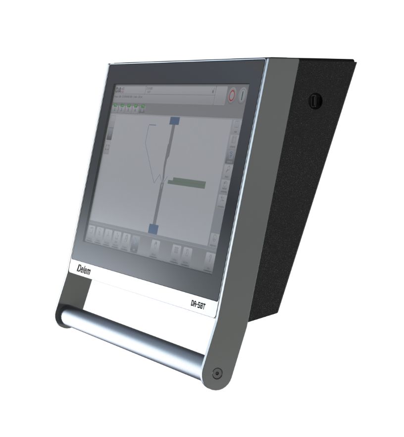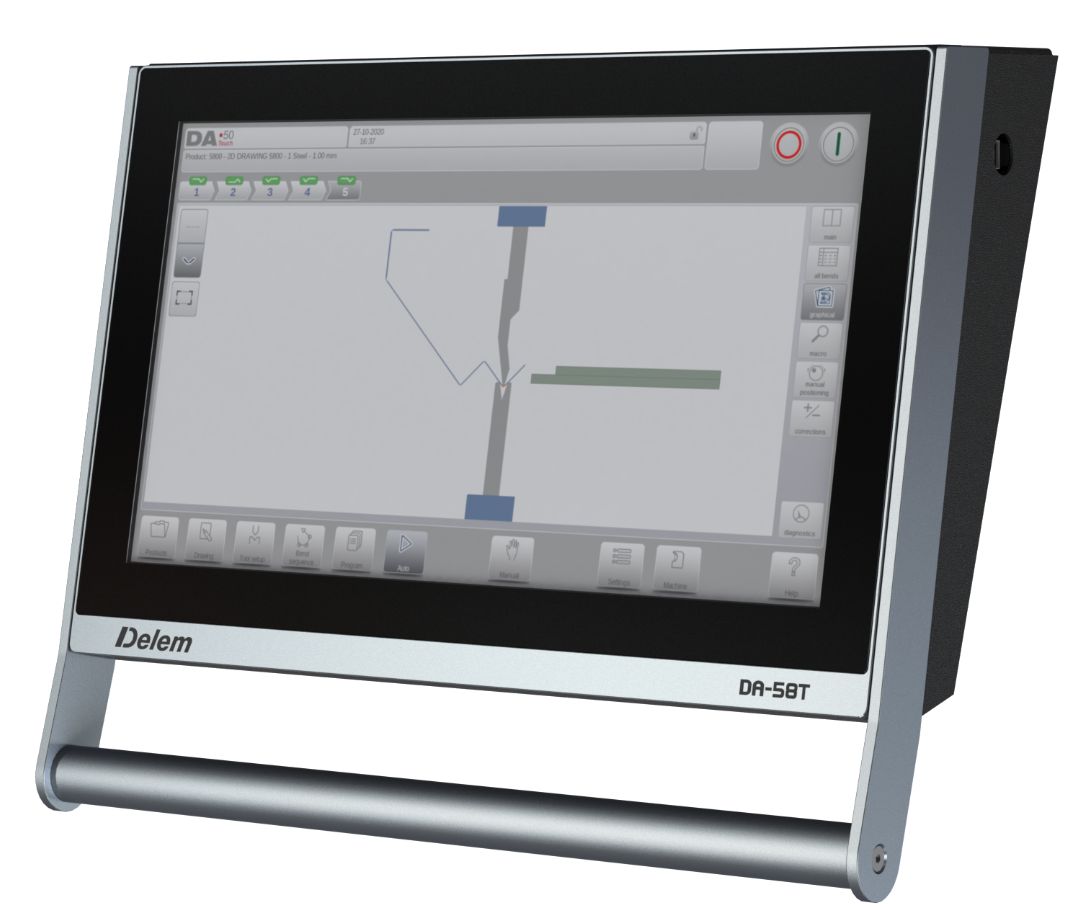 The DA-58Tx, standard capable of controlling up to 4 axes, is housed in a stylish pendulant arm cabinet. Its 18,5″ wide screen high resolution color TFT, with industrial grade multi touch technology, gives access to the user friendly Delem user-interface. It enables direct “hot-key” touch navigation between product programming and actual production.